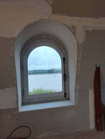 Chantier alliant plâtrerie sèche et plâtrerie traditionnelle. La courbe des châssis des fenêtres a pu être conservée grâce à un système de trainage sur place.