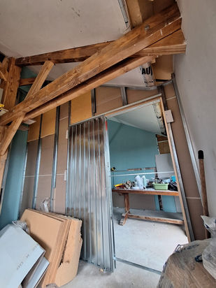 Sur ce chantier, nous avons réalisé l'isolation des murs extérieurs. Une couche d'isolant est d'abord posée sur le mur extérieur, la cloison brique est ensuite bâtie et enduite de plâtre.